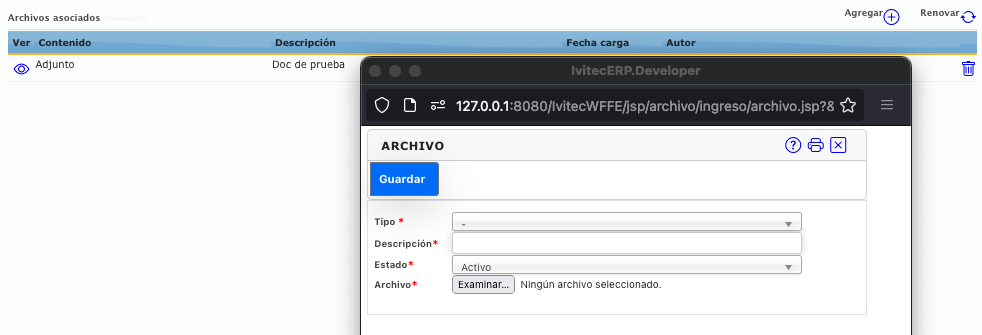 Corresponde al registro de archivos adjuntos relacionados con el objeto seleccionado.