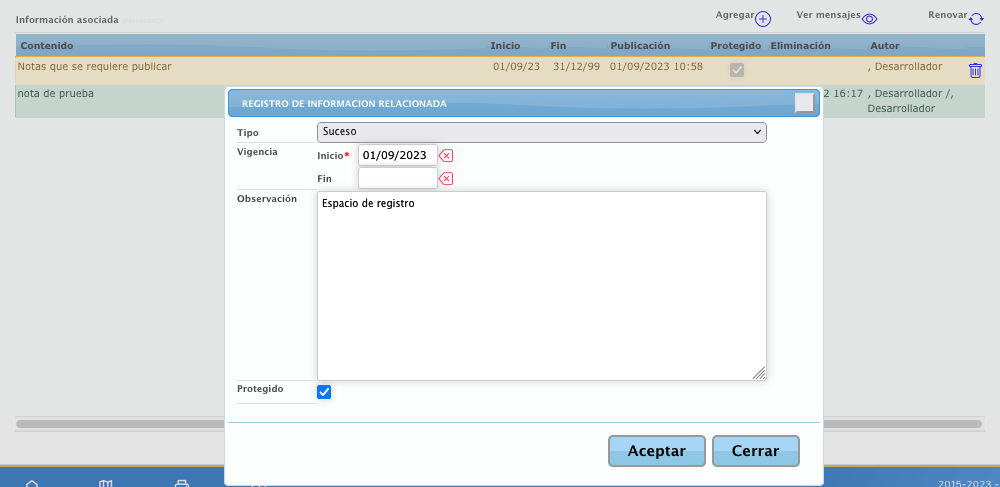 Cada objeto del sistema puede incorporar antecedentes acerca de contenido de interés que se requiera disponibilizar para la compañía. Para esta información se puede dar vigencia y/o tipificar.