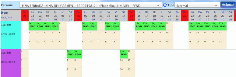 Para asignar dis libres y/o eventos asociados a la persona utilizar el botón "Calendario" (Refierace a Calendario de servicios)