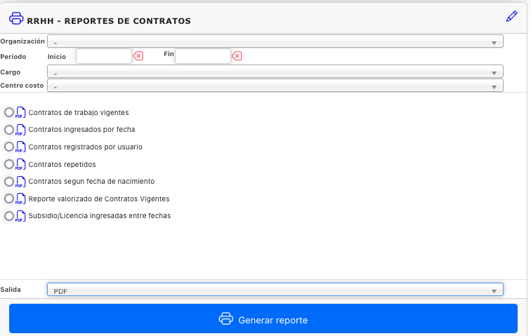 El gestor de reportes en un formulario de orden general que expone las lista de reportes relacionados con el contexto en que se solicita. Se incluyen parámetros genéricos como fechas de inicio y fin, y otros específicos dependiendo del tema que traten.