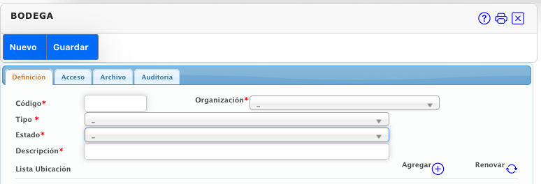 - Organización : Corresponde a la sucursal o unidad organizativa de la compañia. Es determinante puesto que los usuarios que tengan acceso a movimientos de esa bodega deben estar asociados a esa organización.