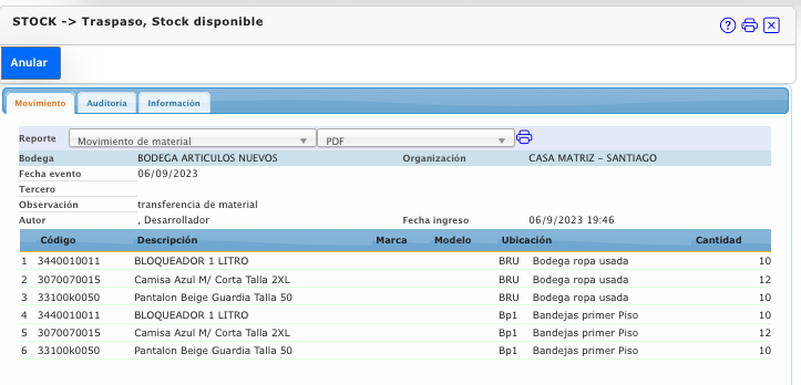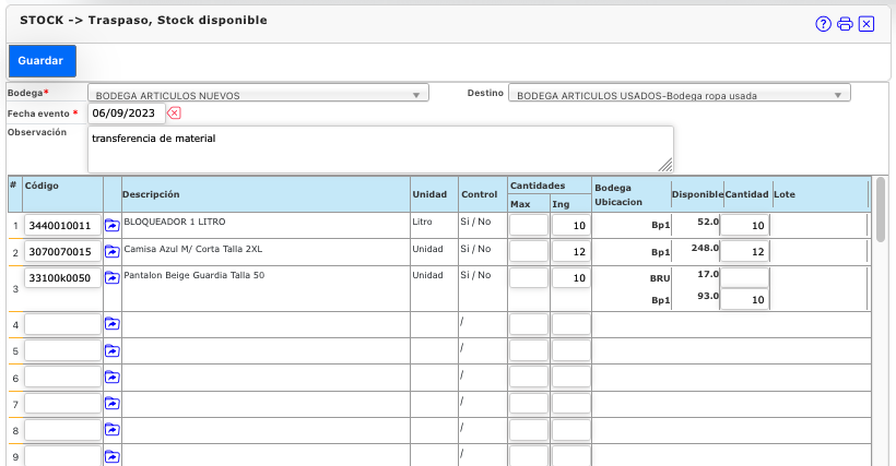 - Cantidades : Presenta las cantidades disponibles del material en cada ubicación.