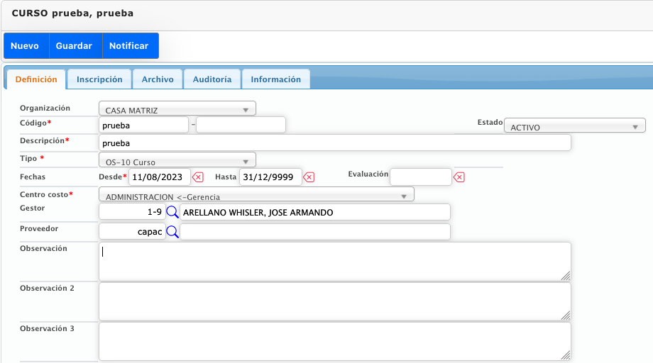 Es el registro de cursos de capacitación destinados a los colaboradores. Este provee la posibilidad de notificar fechas y horarios a los colaboradores asociados por correo electrónico .