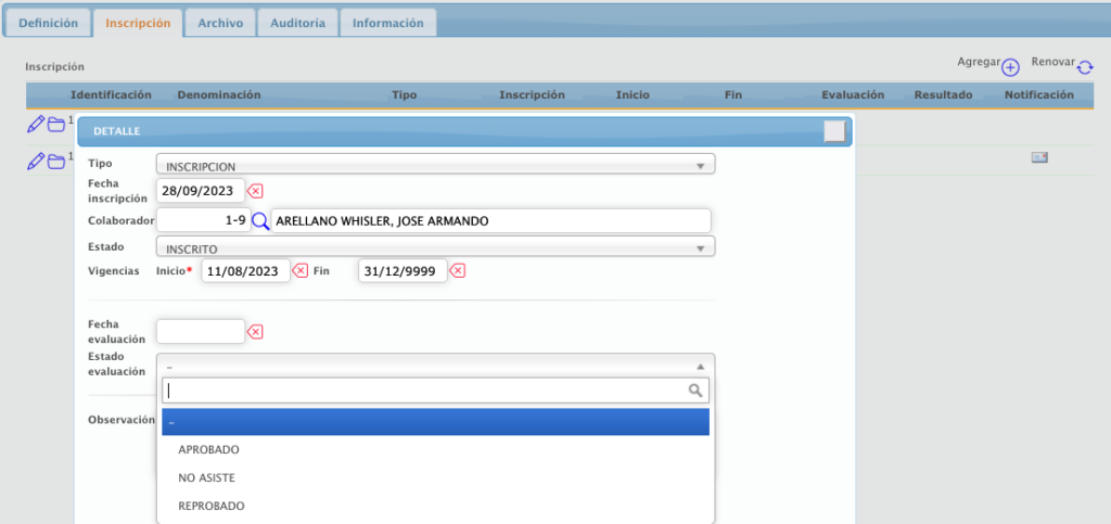 Pestaña Inscripción