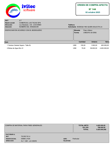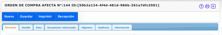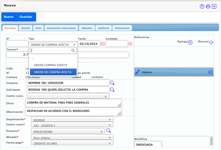 Registro de orden de compra a proveedores del tipo afecto y excento.