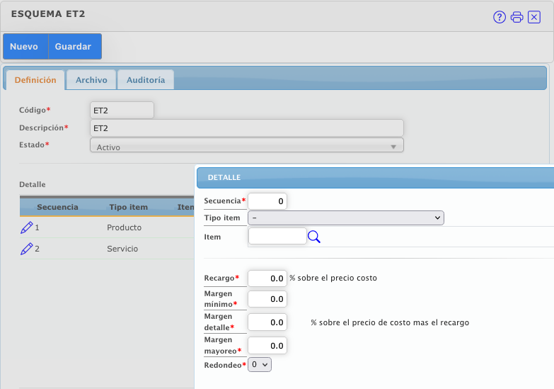 - Recargo : Recargo que se aplicará sobre el precio de costo vigente del servicio o material al momento del cálculo del precio de venta.
